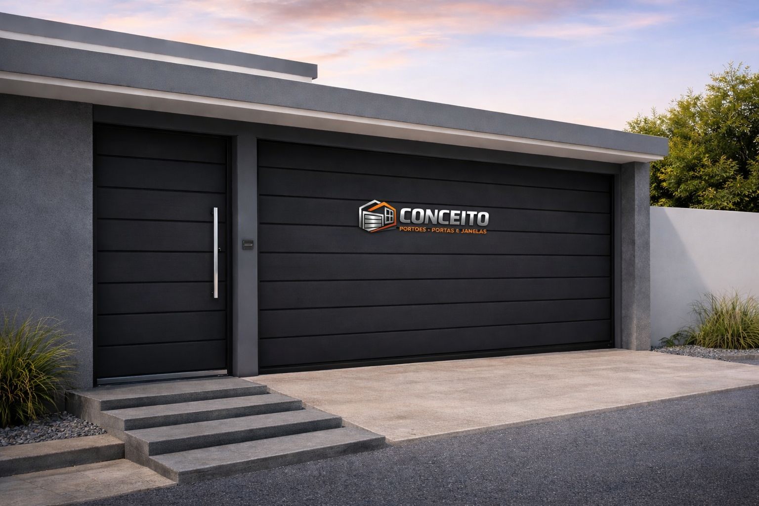 Portão robusto e funcional para garagem com acesso social individualizado. O modelo todo fechado garante segurança e privacidade para sua casa.